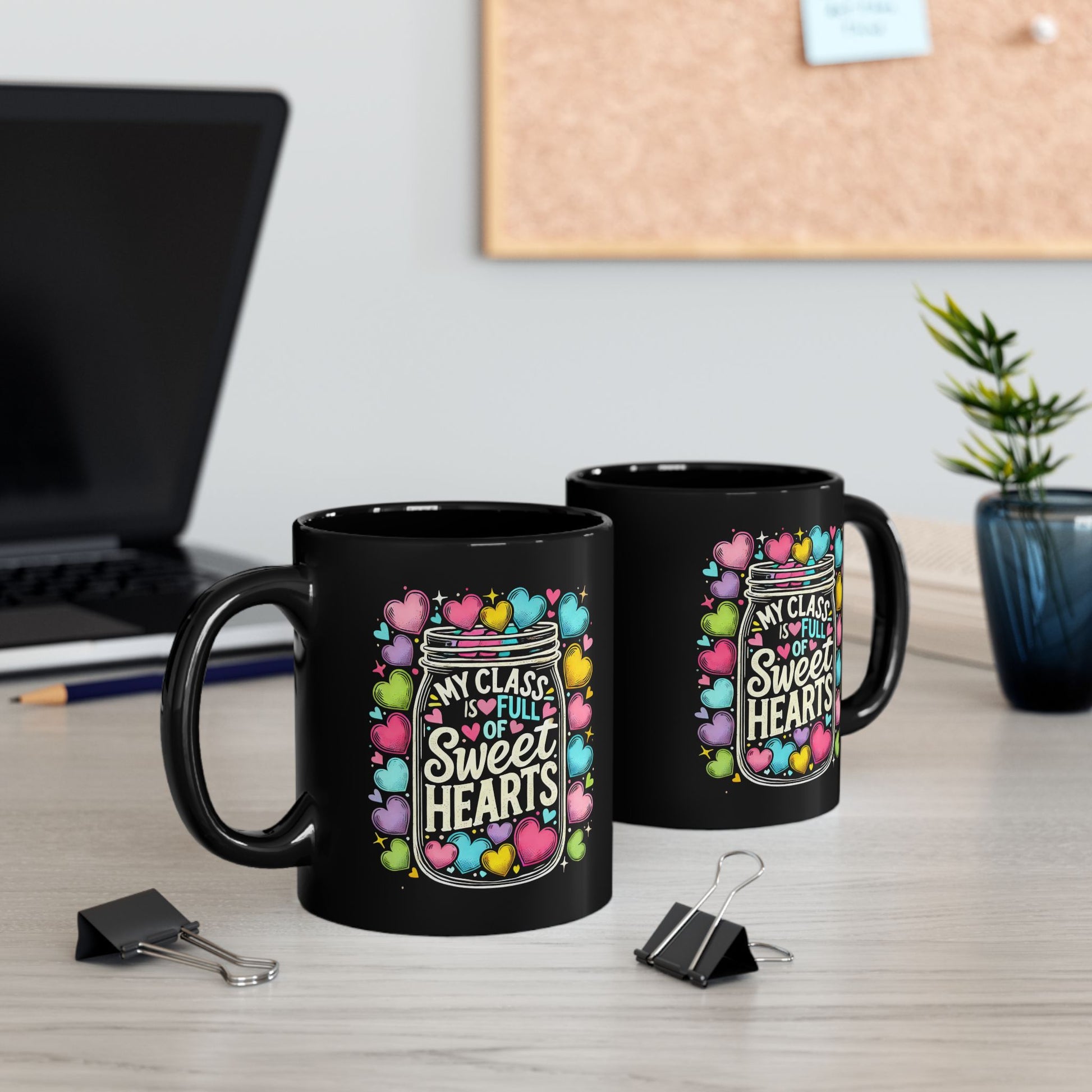 A black ceramic mug with a glossy finish, featuring the quote 'My class is full of sweethearts' perfect for Valentine's Day. This mug is microwave and dishwasher safe, making it a great addition to your morning routine or a thoughtful gift for a teacher or student.